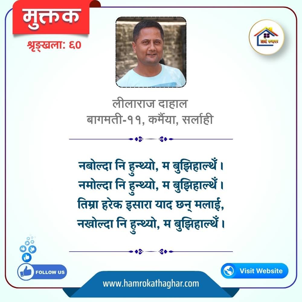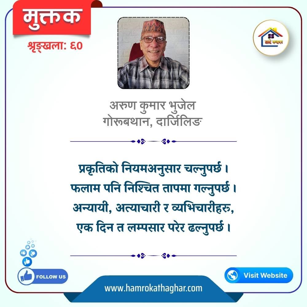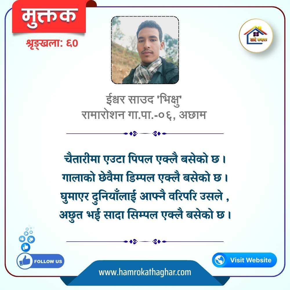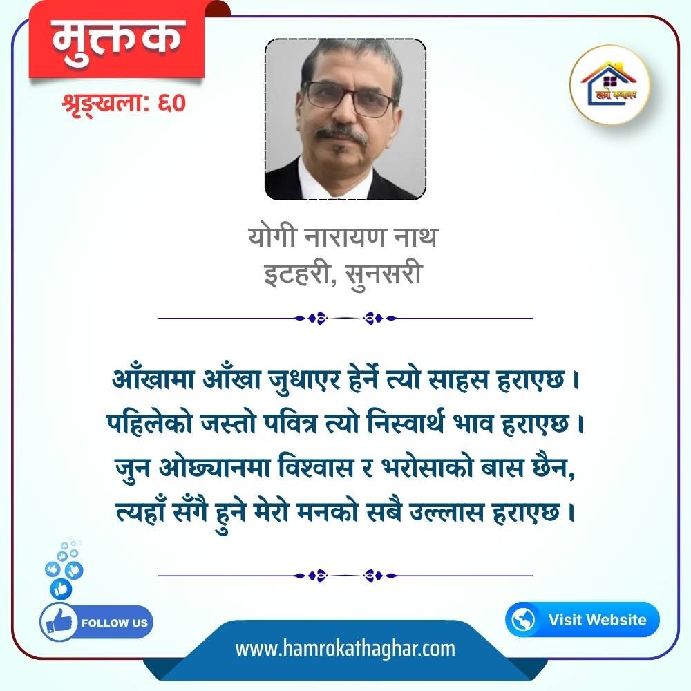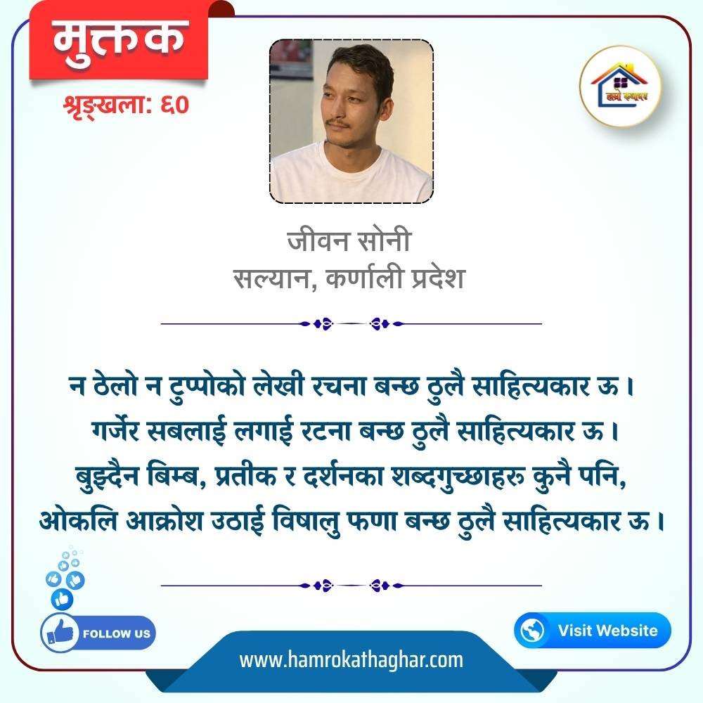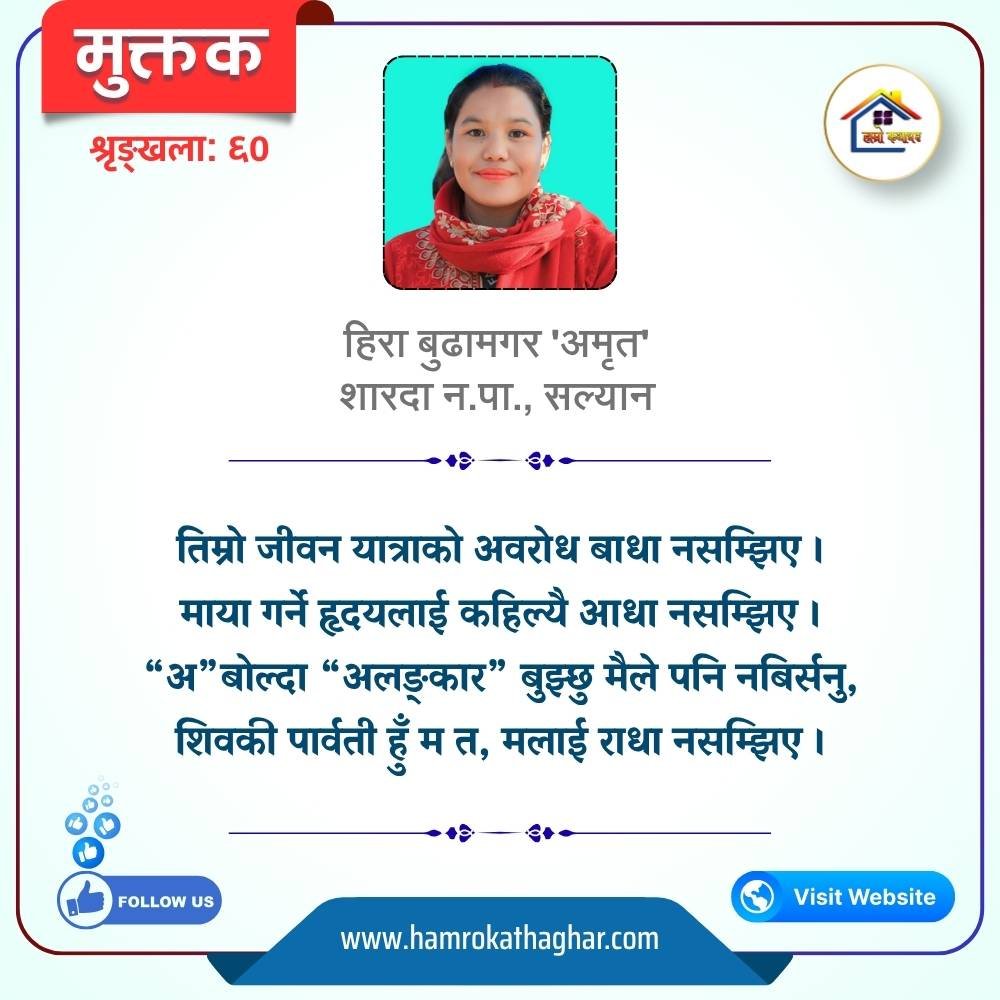 नेपाली भाषा साहित्यलाई माया गरेर यहाँसम्म आइ, यहाँ प्रकाशित लेख/रचनाहरू पढिदिनु भएकोमा तपाईँलाई धेरै धेरै धन्यवाद। तपाईँले भर्खरै माथि पढेको लेख/रचना कस्तो लाग्यो कमेन्ट बक्समा आफ्नो प्रतिक्रिया राख्न सक्नु हुनेछ। आफ्नो मनमा लागेको प्रतिक्रिया राख्न तपाईँ स्वतन्त्र हुनुहुन्छ। यदि तपाईँ पनि नेपाली भाषा साहित्यमा कलम चलाउनु हुन्छ भने आफ्नो छोटो परिचय र एक प्रति अनुहार चिनिने तस्बिर सहित आफ्ना लेख/रचनाहरू हामीलाई hamrokathaghar@gmail.com मा पठाउन सक्नु हुनेछ। अन्य कुनै पनि जानकारीका लागि +९१८७३८०९३५७३ नम्बरमा ह्वाट्सएप गर्न सक्नु हुनेछ। धन्यवाद । नोट: यहाँ प्रकाशित कुनै पनि लेख/रचनाहरू लेखकको वा 'हाम्रो कथा घर' को अनुमति बिना कुनै पनि माध्यमबाट प्रकाशन प्रसारण गर्न पाइने छैन । अन्यथा, यस्तो गरिएको पाएमा प्रचलित कानुन बमोजिम कारबाही गरिने जानकारी गराउँदछौ।
