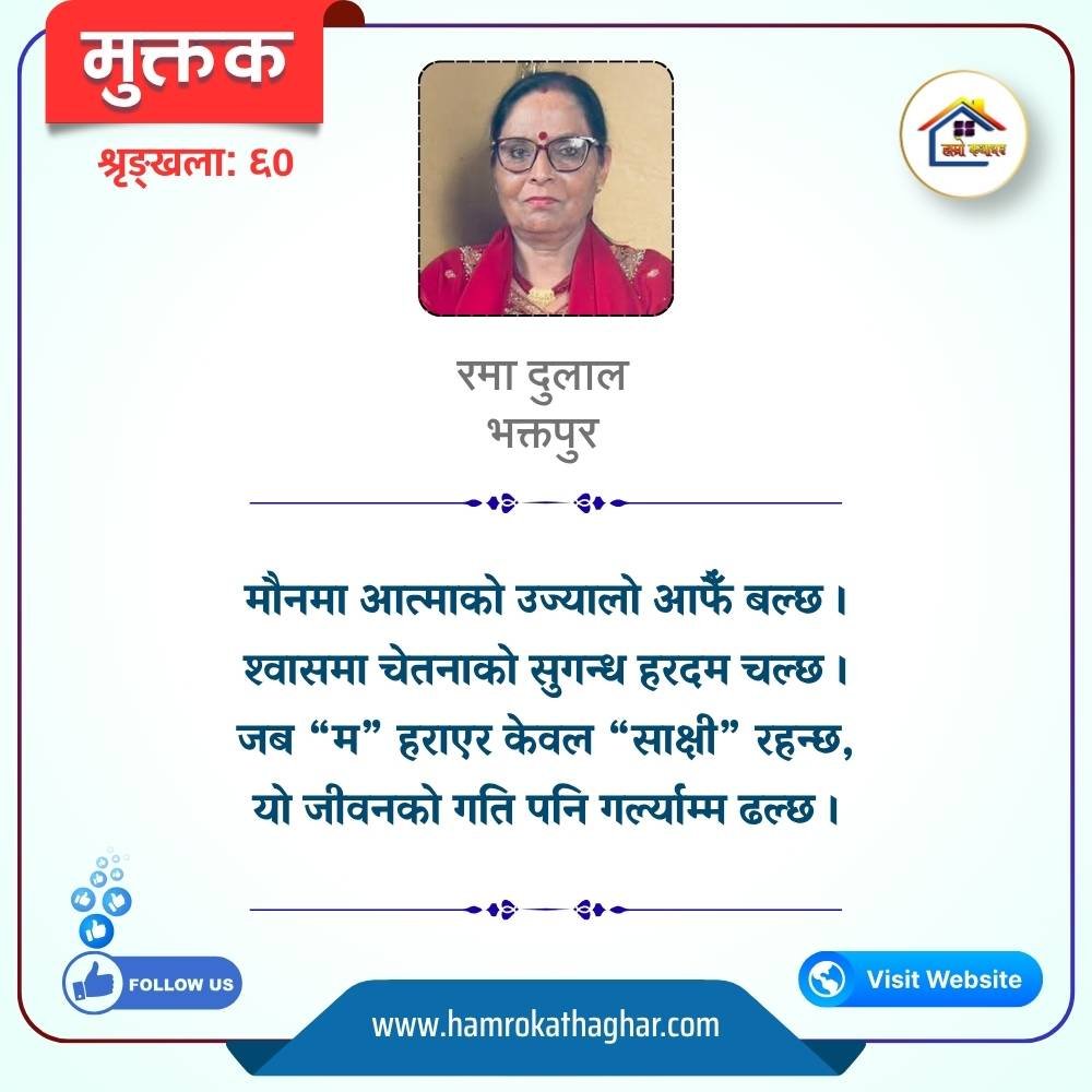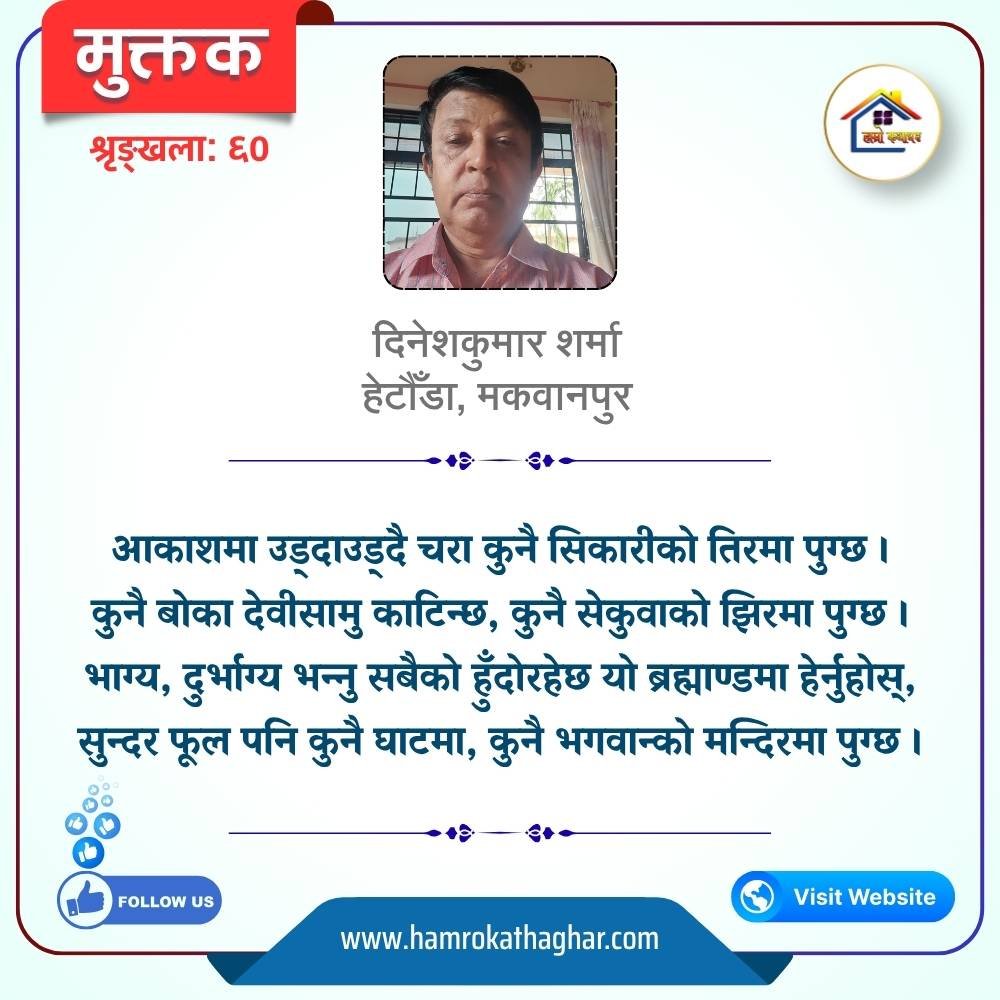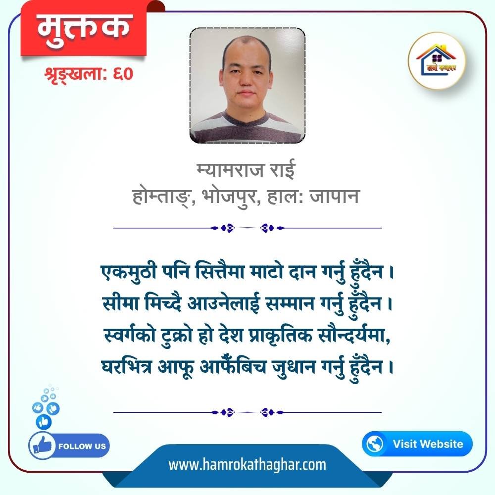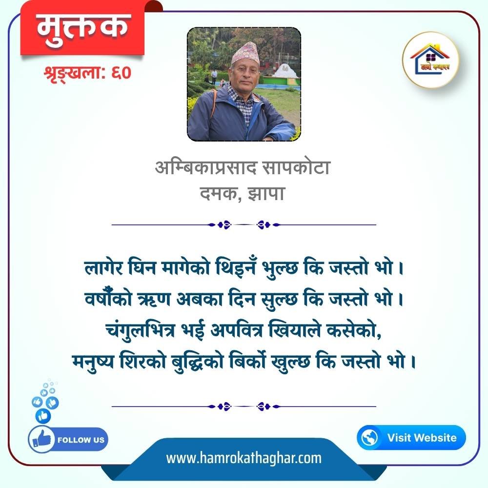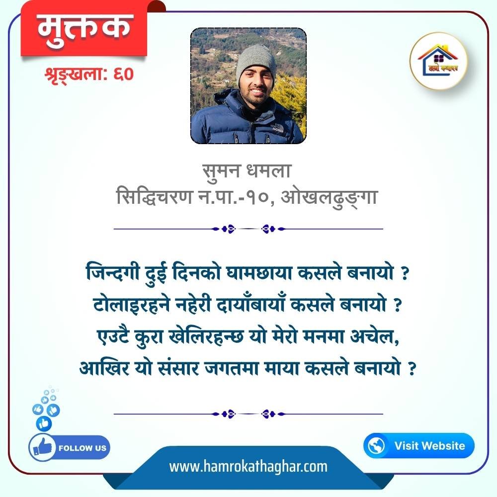 नेपाली भाषा साहित्यलाई माया गरेर यहाँसम्म आइ, यहाँ प्रकाशित लेख/रचनाहरू पढिदिनु भएकोमा तपाईँलाई धेरै धेरै धन्यवाद। तपाईँले भर्खरै माथि पढेको लेख/रचना कस्तो लाग्यो कमेन्ट बक्समा आफ्नो प्रतिक्रिया राख्न सक्नु हुनेछ। आफ्नो मनमा लागेको प्रतिक्रिया राख्न तपाईँ स्वतन्त्र हुनुहुन्छ। यदि तपाईँ पनि नेपाली भाषा साहित्यमा कलम चलाउनु हुन्छ भने आफ्नो छोटो परिचय र एक प्रति अनुहार चिनिने तस्बिर सहित आफ्ना लेख/रचनाहरू हामीलाई hamrokathaghar@gmail.com मा पठाउन सक्नु हुनेछ। अन्य कुनै पनि जानकारीका लागि +९१८७३८०९३५७३ नम्बरमा ह्वाट्सएप गर्न सक्नु हुनेछ। धन्यवाद । नोट: यहाँ प्रकाशित कुनै पनि लेख/रचनाहरू लेखकको वा 'हाम्रो कथा घर' को अनुमति बिना कुनै पनि माध्यमबाट प्रकाशन प्रसारण गर्न पाइने छैन । अन्यथा, यस्तो गरिएको पाएमा प्रचलित कानुन बमोजिम कारबाही गरिने जानकारी गराउँदछौ।