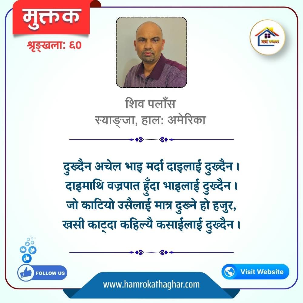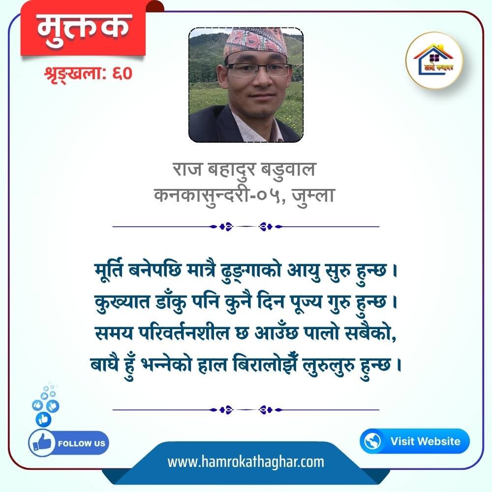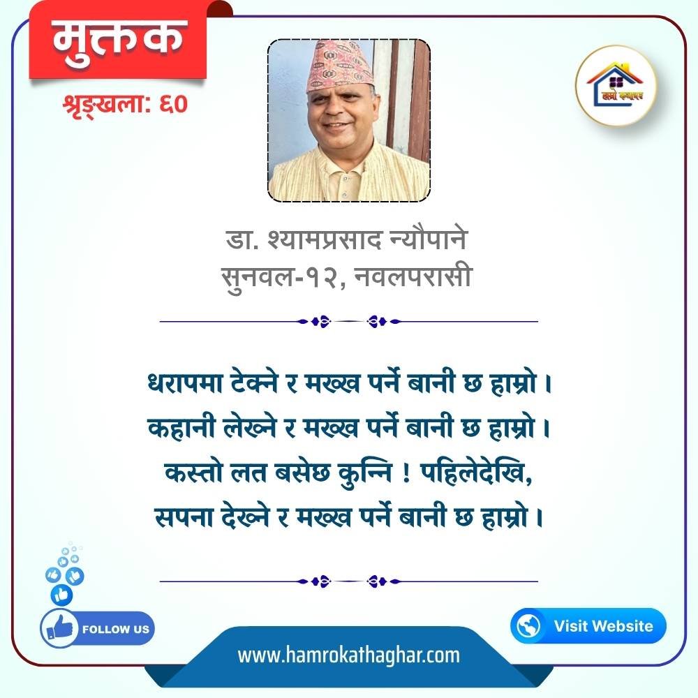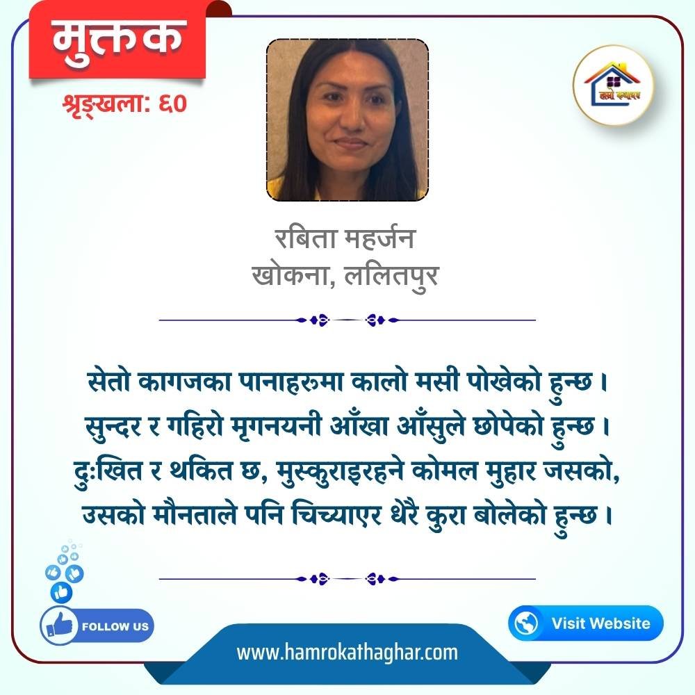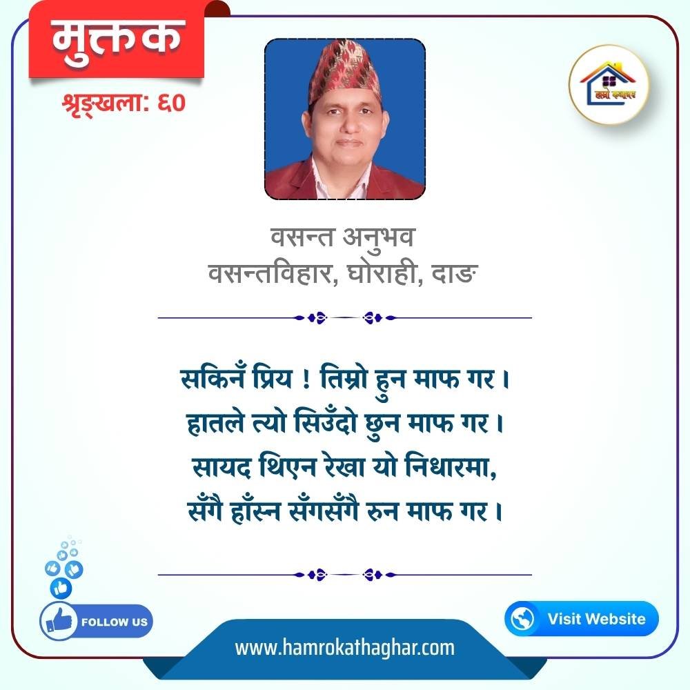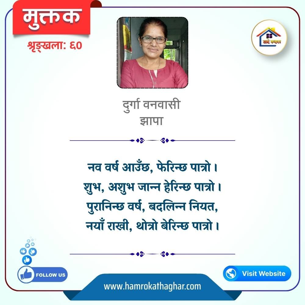 नेपाली भाषा साहित्यलाई माया गरेर यहाँसम्म आइ, यहाँ प्रकाशित लेख/रचनाहरू पढिदिनु भएकोमा तपाईँलाई धेरै धेरै धन्यवाद। तपाईँले भर्खरै माथि पढेको लेख/रचना कस्तो लाग्यो कमेन्ट बक्समा आफ्नो प्रतिक्रिया राख्न सक्नु हुनेछ। आफ्नो मनमा लागेको प्रतिक्रिया राख्न तपाईँ स्वतन्त्र हुनुहुन्छ। यदि तपाईँ पनि नेपाली भाषा साहित्यमा कलम चलाउनु हुन्छ भने आफ्नो छोटो परिचय र एक प्रति अनुहार चिनिने तस्बिर सहित आफ्ना लेख/रचनाहरू हामीलाई hamrokathaghar@gmail.com मा पठाउन सक्नु हुनेछ। अन्य कुनै पनि जानकारीका लागि +९१८७३८०९३५७३ नम्बरमा ह्वाट्सएप गर्न सक्नु हुनेछ। धन्यवाद । नोट: यहाँ प्रकाशित कुनै पनि लेख/रचनाहरू लेखकको वा 'हाम्रो कथा घर' को अनुमति बिना कुनै पनि माध्यमबाट प्रकाशन प्रसारण गर्न पाइने छैन । अन्यथा, यस्तो गरिएको पाएमा प्रचलित कानुन बमोजिम कारबाही गरिने जानकारी गराउँदछौ।