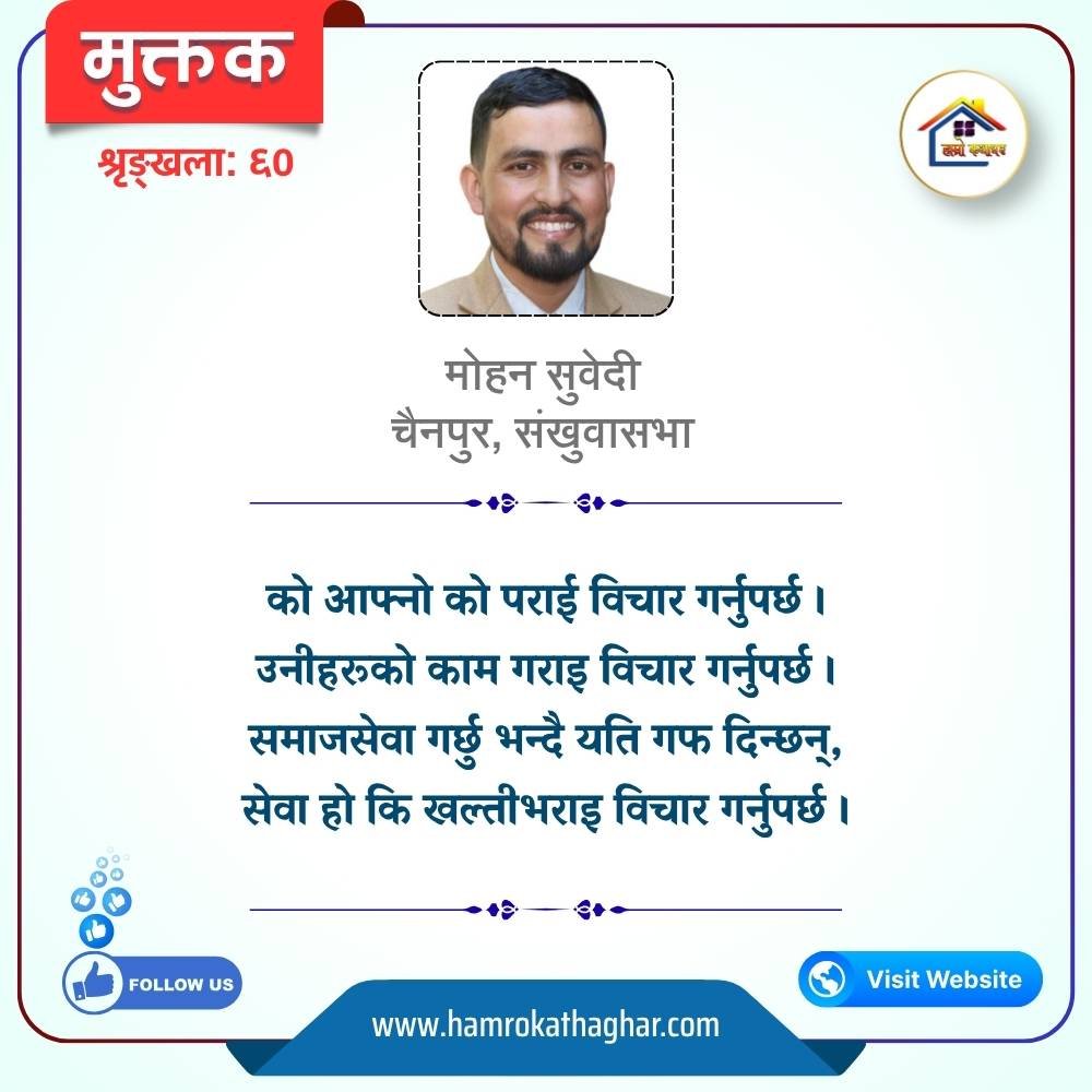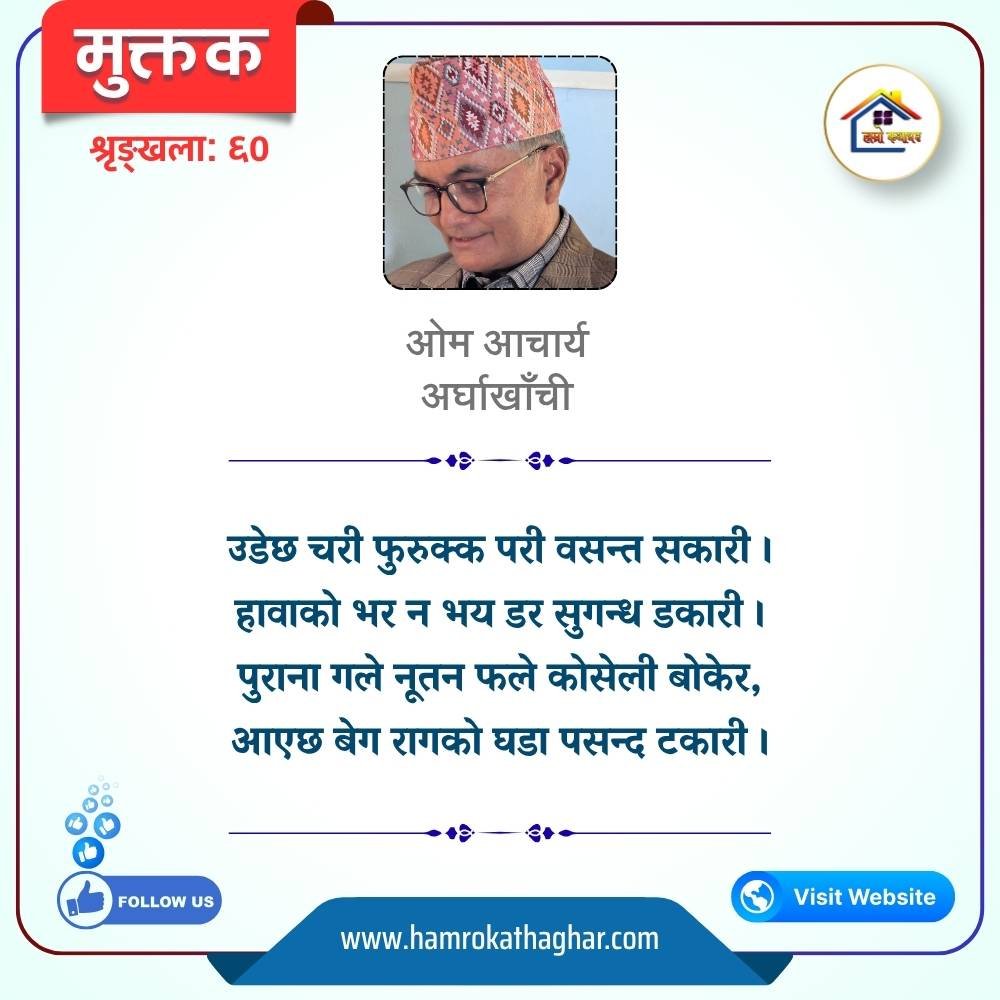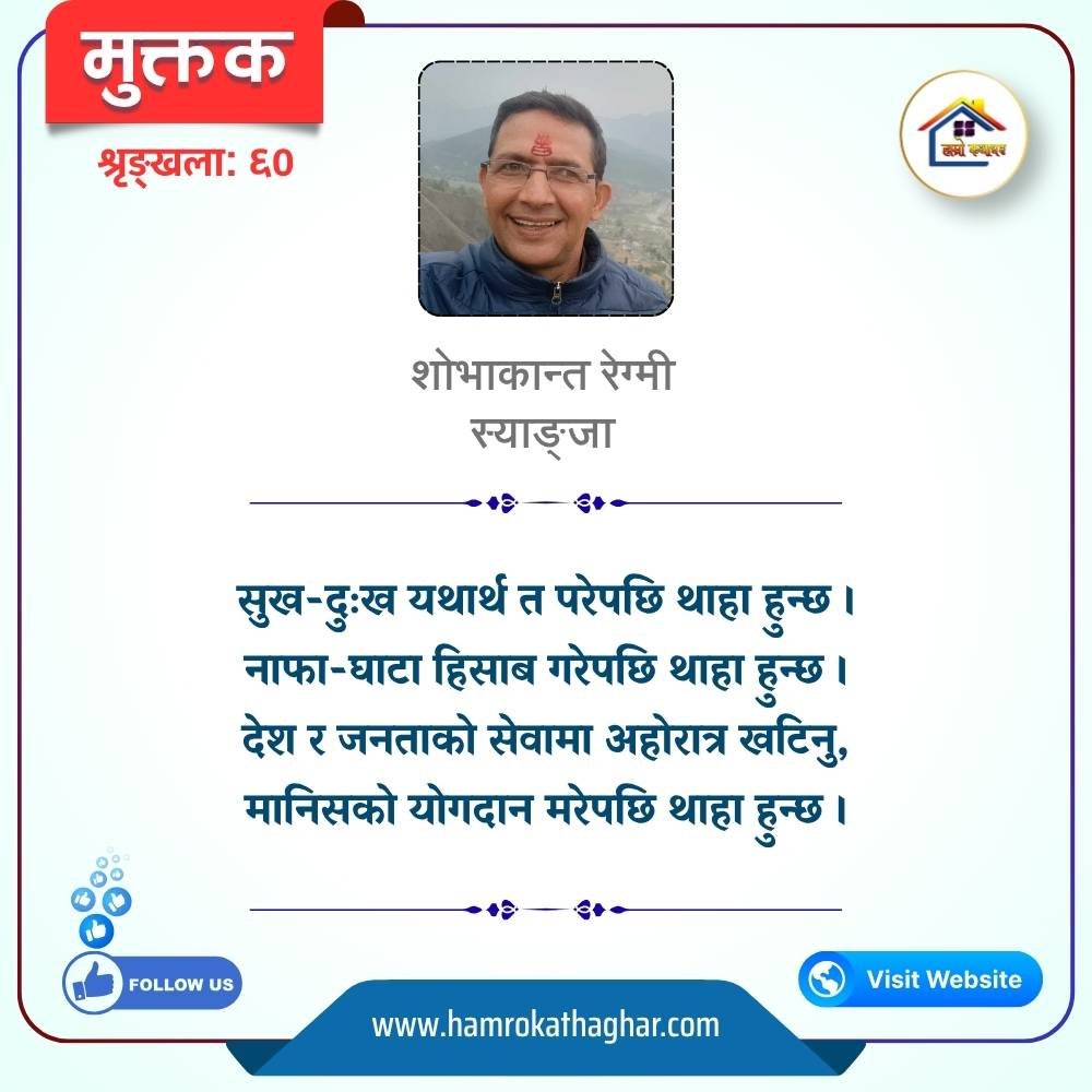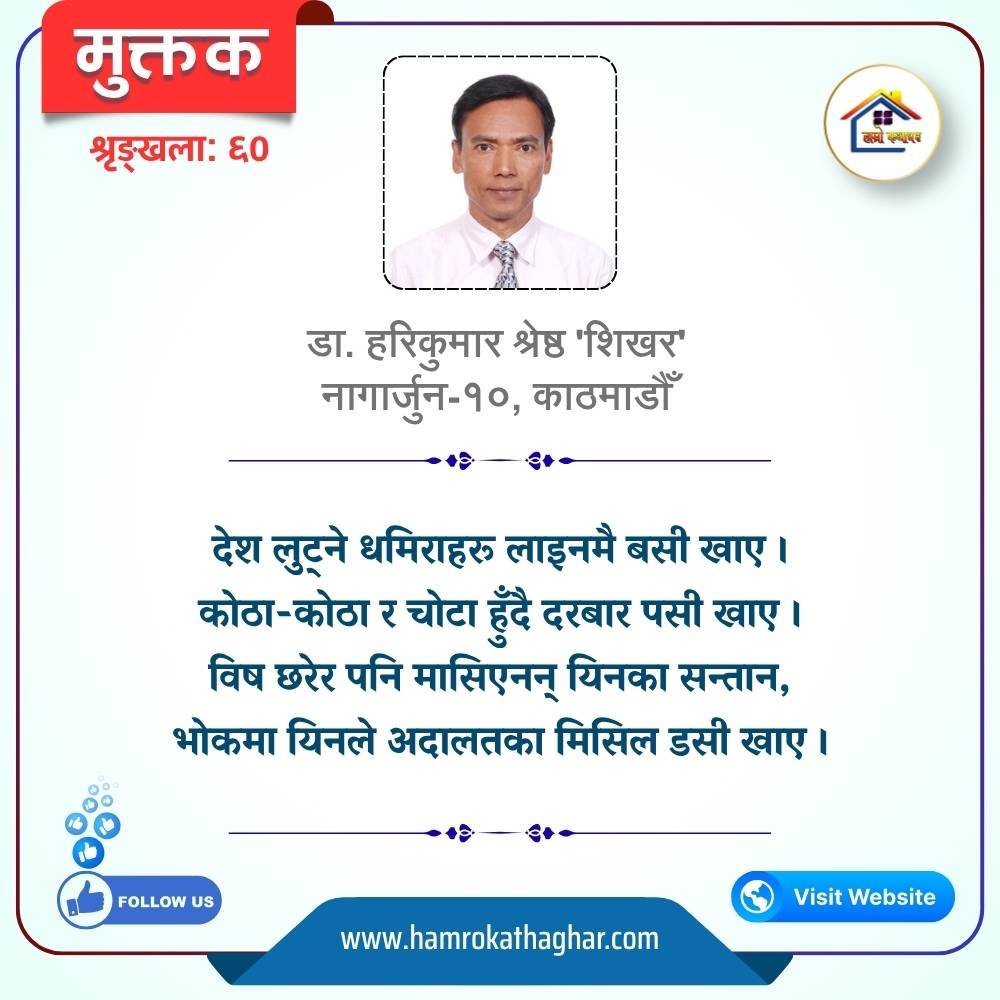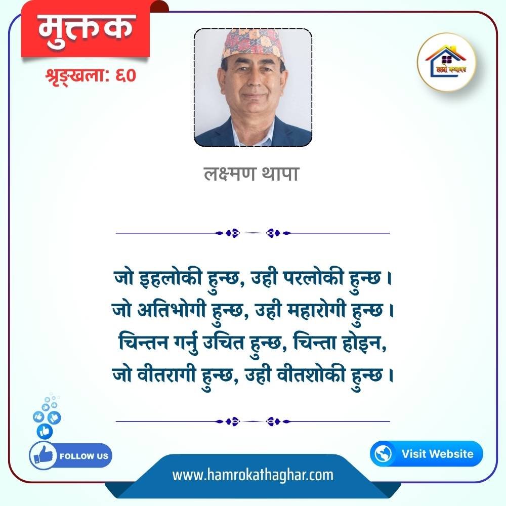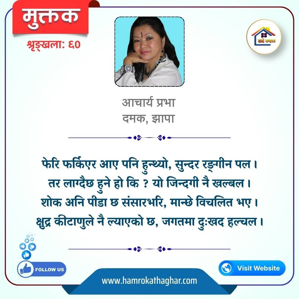 नेपाली भाषा साहित्यलाई माया गरेर यहाँसम्म आइ, यहाँ प्रकाशित लेख/रचनाहरू पढिदिनु भएकोमा तपाईँलाई धेरै धेरै धन्यवाद। तपाईँले भर्खरै माथि पढेको लेख/रचना कस्तो लाग्यो कमेन्ट बक्समा आफ्नो प्रतिक्रिया राख्न सक्नु हुनेछ। आफ्नो मनमा लागेको प्रतिक्रिया राख्न तपाईँ स्वतन्त्र हुनुहुन्छ। यदि तपाईँ पनि नेपाली भाषा साहित्यमा कलम चलाउनु हुन्छ भने आफ्नो छोटो परिचय र एक प्रति अनुहार चिनिने तस्बिर सहित आफ्ना लेख/रचनाहरू हामीलाई hamrokathaghar@gmail.com मा पठाउन सक्नु हुनेछ। अन्य कुनै पनि जानकारीका लागि +९१८७३८०९३५७३ नम्बरमा ह्वाट्सएप गर्न सक्नु हुनेछ। धन्यवाद । नोट: यहाँ प्रकाशित कुनै पनि लेख/रचनाहरू लेखकको वा 'हाम्रो कथा घर' को अनुमति बिना कुनै पनि माध्यमबाट प्रकाशन प्रसारण गर्न पाइने छैन । अन्यथा, यस्तो गरिएको पाएमा प्रचलित कानुन बमोजिम कारबाही गरिने जानकारी गराउँदछौ।