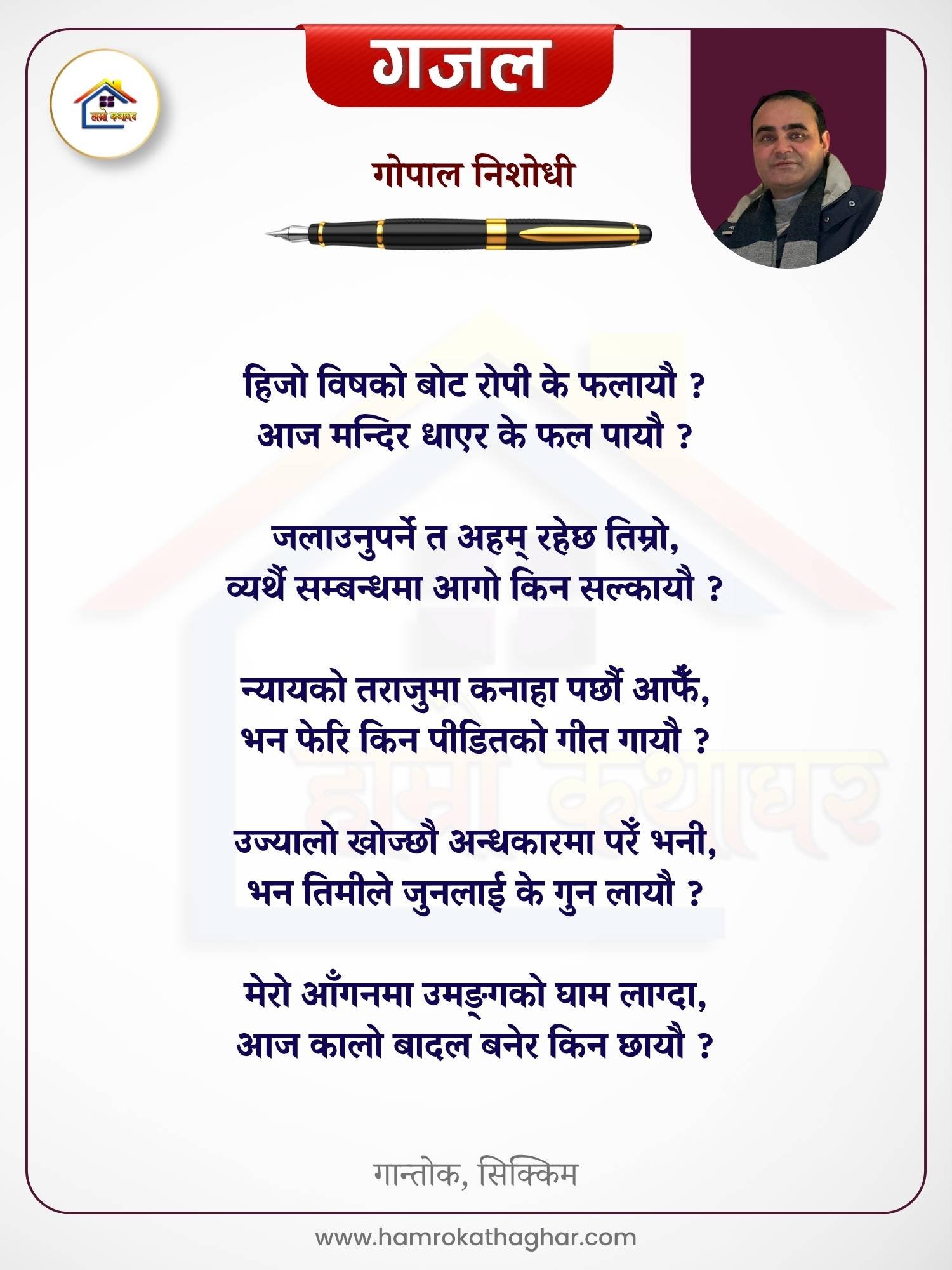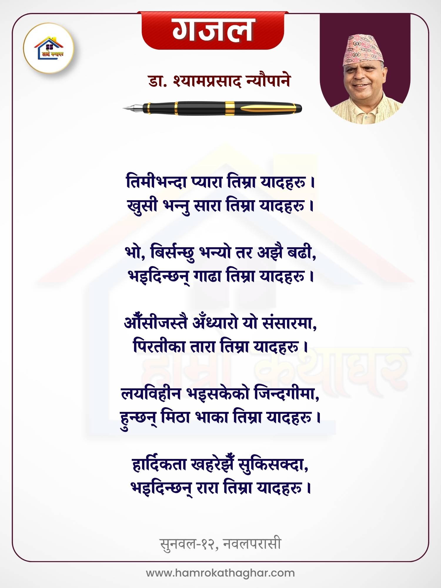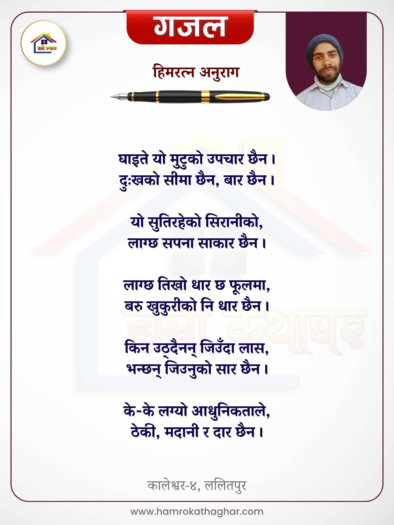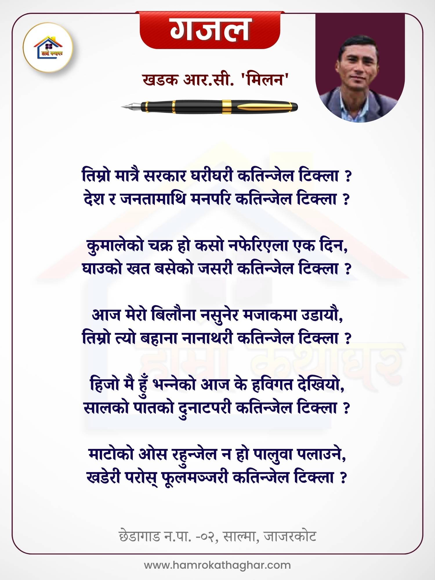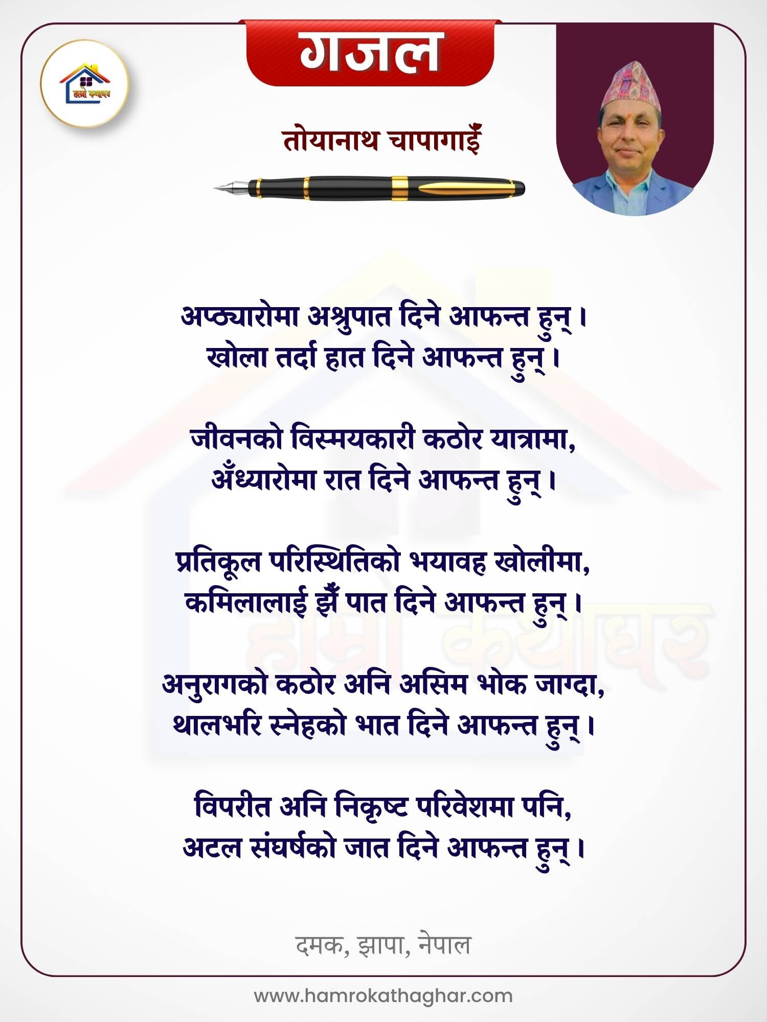 नेपाली भाषा साहित्यलाई माया गरेर यहाँसम्म आइ, यहाँ प्रकाशित लेख/रचनाहरू पढिदिनु भएकोमा तपाईँलाई धेरै धेरै धन्यवाद। तपाईँले भर्खरै माथि पढेको लेख/रचना कस्तो लाग्यो कमेन्ट बक्समा आफ्नो प्रतिक्रिया राख्न सक्नु हुनेछ। आफ्नो मनमा लागेको प्रतिक्रिया राख्न तपाईँ स्वतन्त्र हुनुहुन्छ। यदि तपाईँ पनि नेपाली भाषा साहित्यमा कलम चलाउनु हुन्छ भने आफ्नो छोटो परिचय र एक प्रति अनुहार चिनिने तस्बिर सहित आफ्ना लेख/रचनाहरू हामीलाई hamrokathaghar@gmail.com मा पठाउन सक्नु हुनेछ। अन्य कुनै पनि जानकारीका लागि +९१८७३८०९३५७३ नम्बरमा ह्वाट्सएप गर्न सक्नु हुनेछ। धन्यवाद । नोट: यहाँ प्रकाशित कुनै पनि लेख/रचनाहरू लेखकको वा 'हाम्रो कथा घर' को अनुमति बिना कुनै पनि माध्यमबाट प्रकाशन प्रसारण गर्न पाइने छैन । अन्यथा, यस्तो गरिएको पाएमा प्रचलित कानुन बमोजिम कारबाही गरिने जानकारी गराउँदछौ।