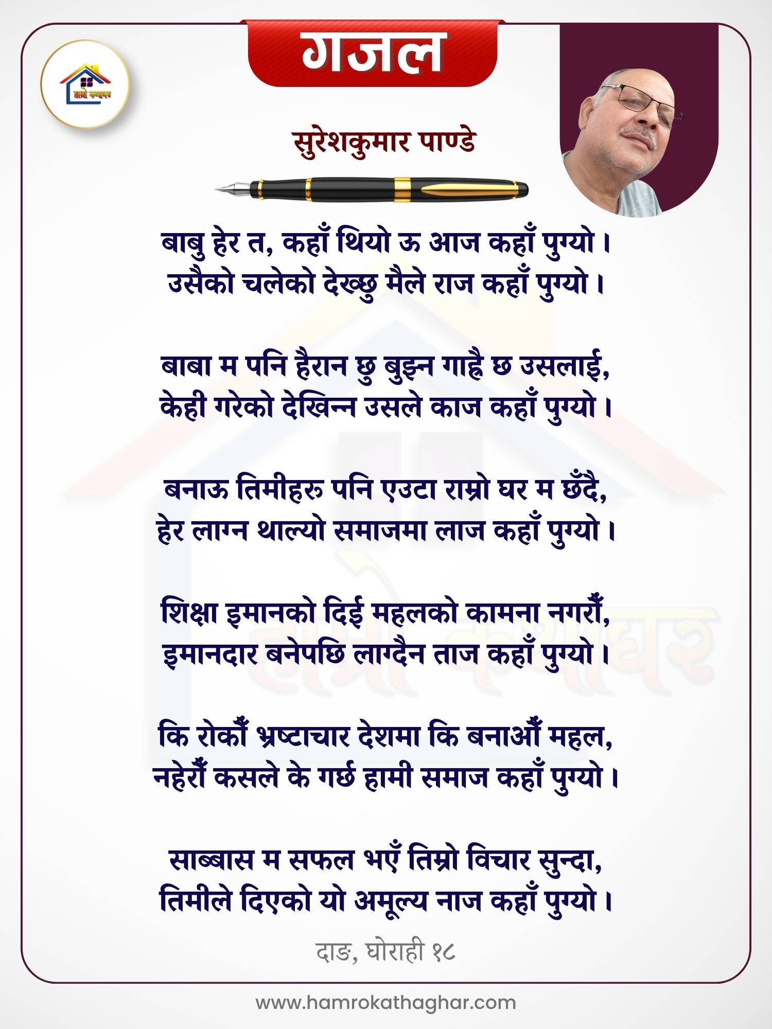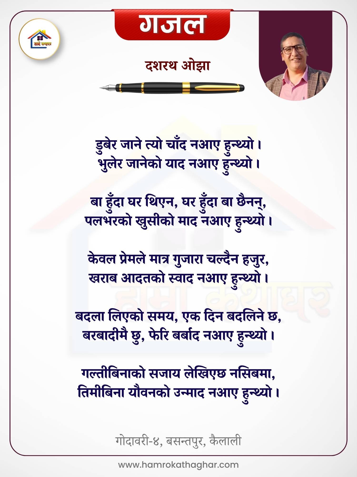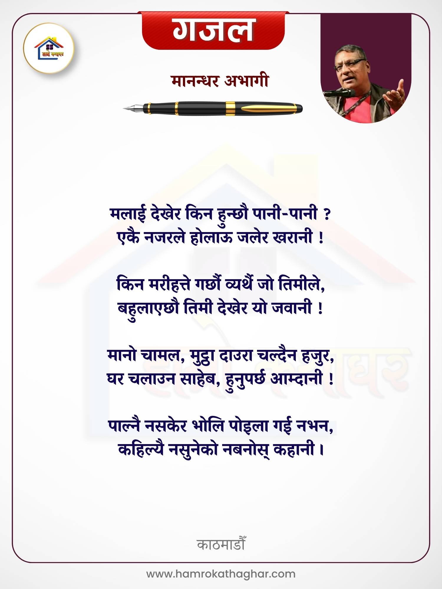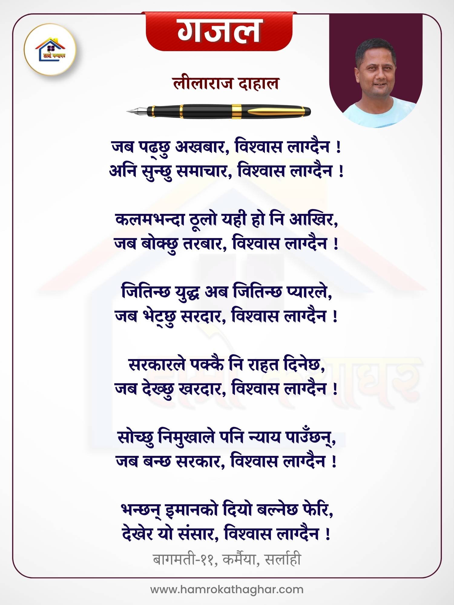 नेपाली भाषा साहित्यलाई माया गरेर यहाँसम्म आइ, यहाँ प्रकाशित लेख/रचनाहरू पढिदिनु भएकोमा तपाईँलाई धेरै धेरै धन्यवाद। तपाईँले भर्खरै माथि पढेको लेख/रचना कस्तो लाग्यो कमेन्ट बक्समा आफ्नो प्रतिक्रिया राख्न सक्नु हुनेछ। आफ्नो मनमा लागेको प्रतिक्रिया राख्न तपाईँ स्वतन्त्र हुनुहुन्छ। यदि तपाईँ पनि नेपाली भाषा साहित्यमा कलम चलाउनु हुन्छ भने आफ्नो छोटो परिचय र एक प्रति अनुहार चिनिने तस्बिर सहित आफ्ना लेख/रचनाहरू हामीलाई hamrokathaghar@gmail.com मा पठाउन सक्नु हुनेछ। अन्य कुनै पनि जानकारीका लागि +९१८७३८०९३५७३ नम्बरमा ह्वाट्सएप गर्न सक्नु हुनेछ। धन्यवाद । नोट: यहाँ प्रकाशित कुनै पनि लेख/रचनाहरू लेखकको वा 'हाम्रो कथा घर' को अनुमति बिना कुनै पनि माध्यमबाट प्रकाशन प्रसारण गर्न पाइने छैन । अन्यथा, यस्तो गरिएको पाएमा प्रचलित कानुन बमोजिम कारबाही गरिने जानकारी गराउँदछौ।