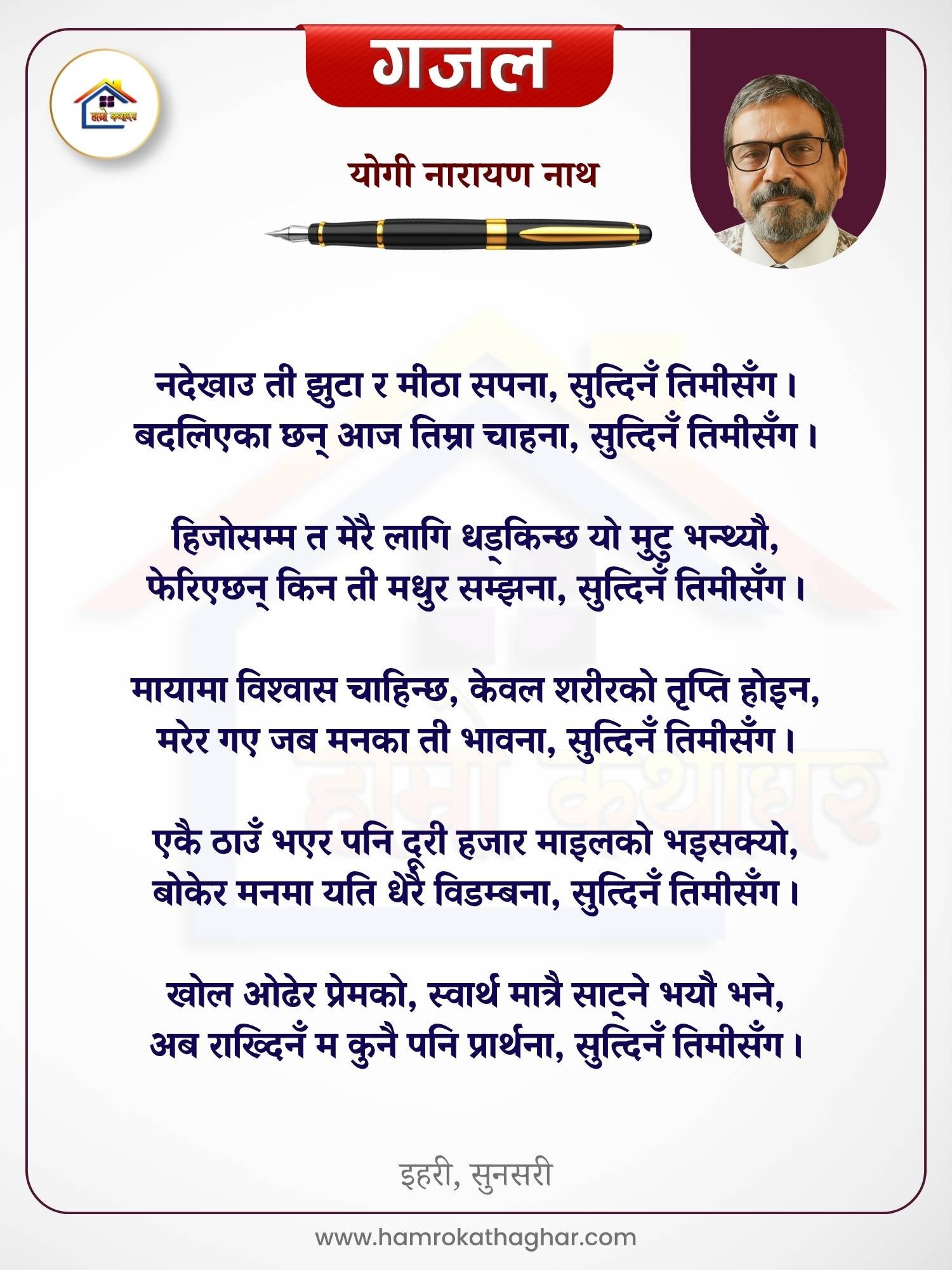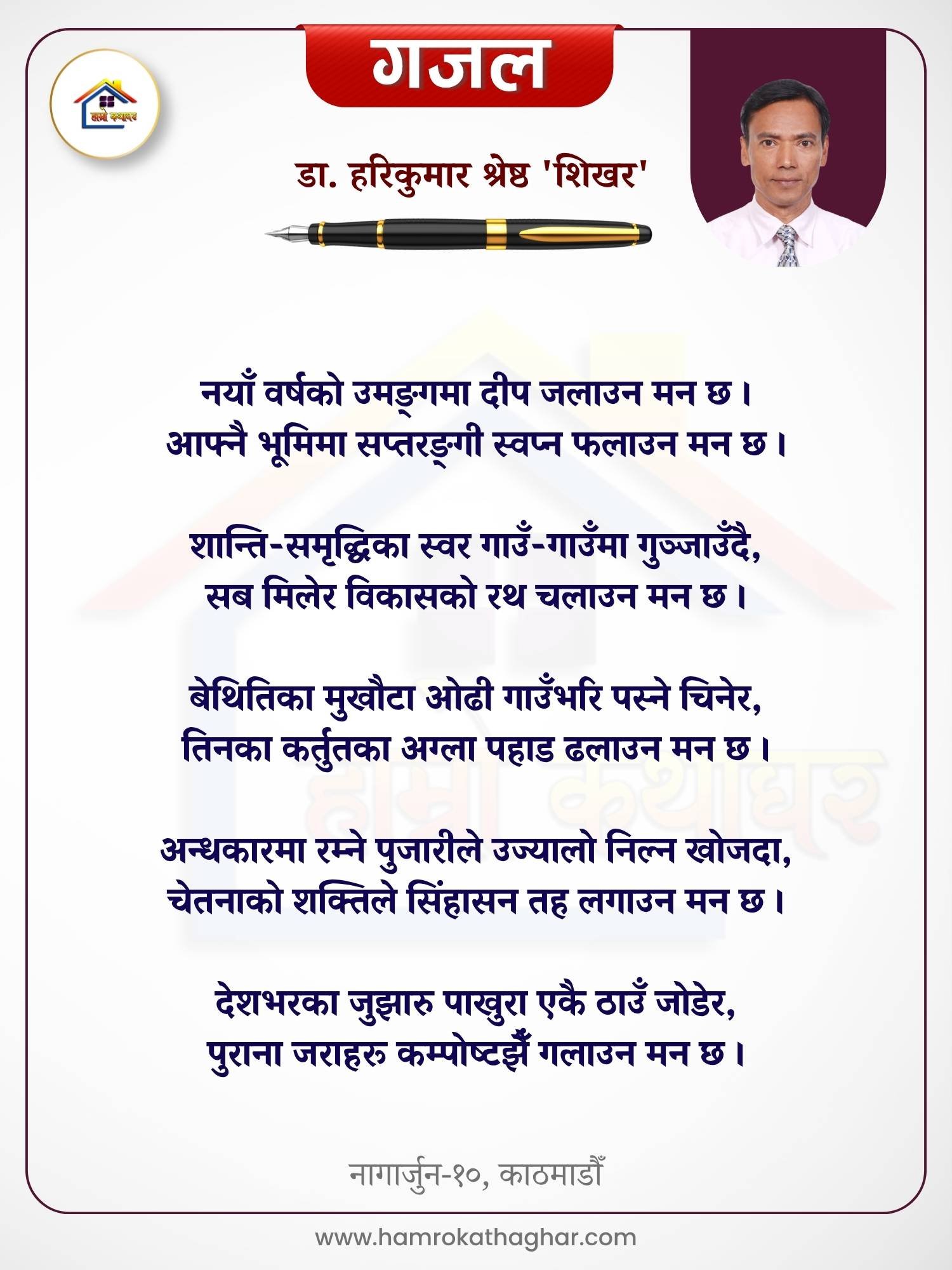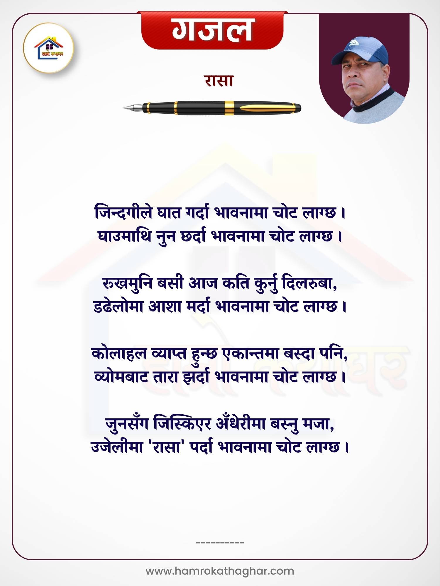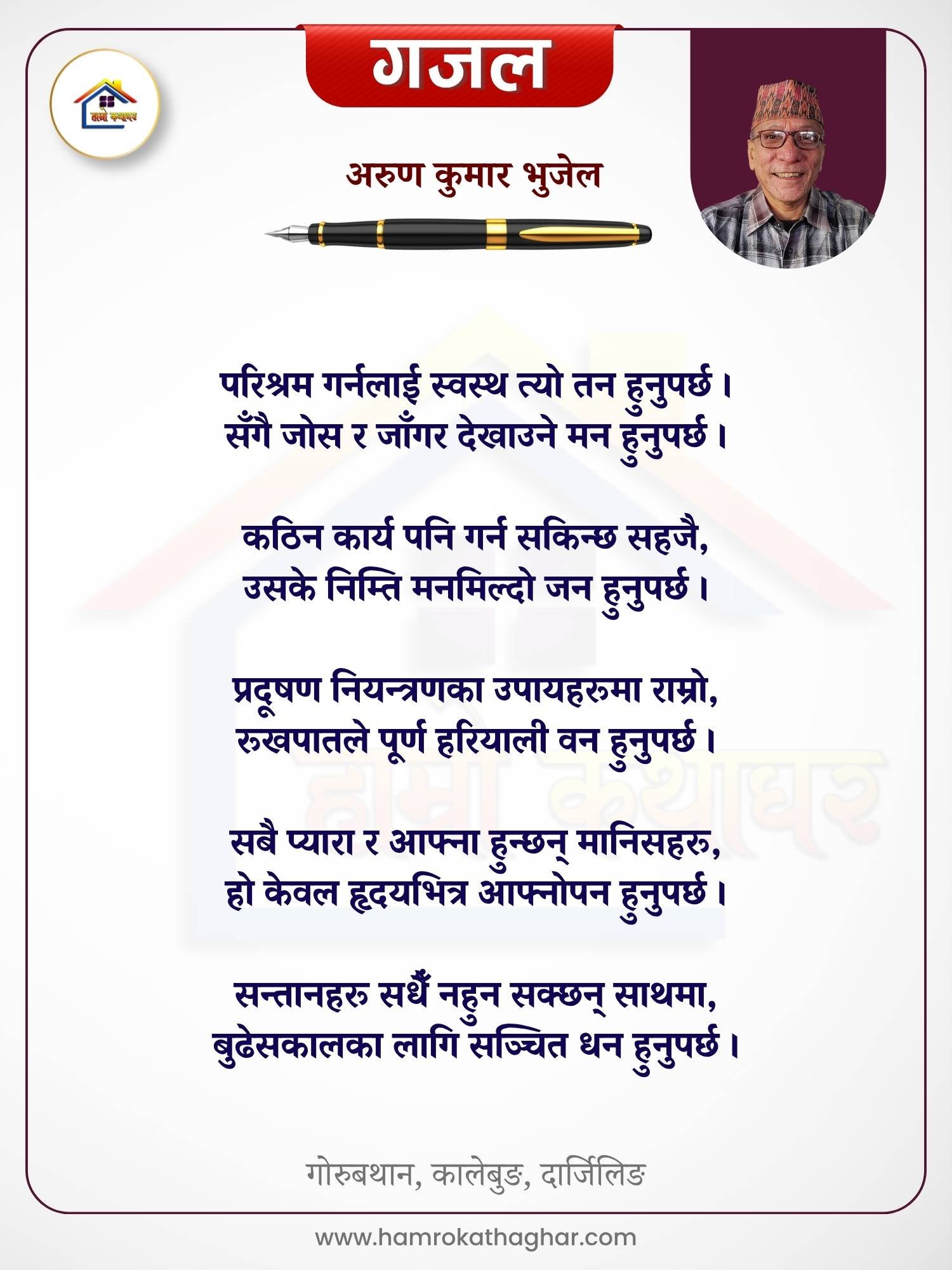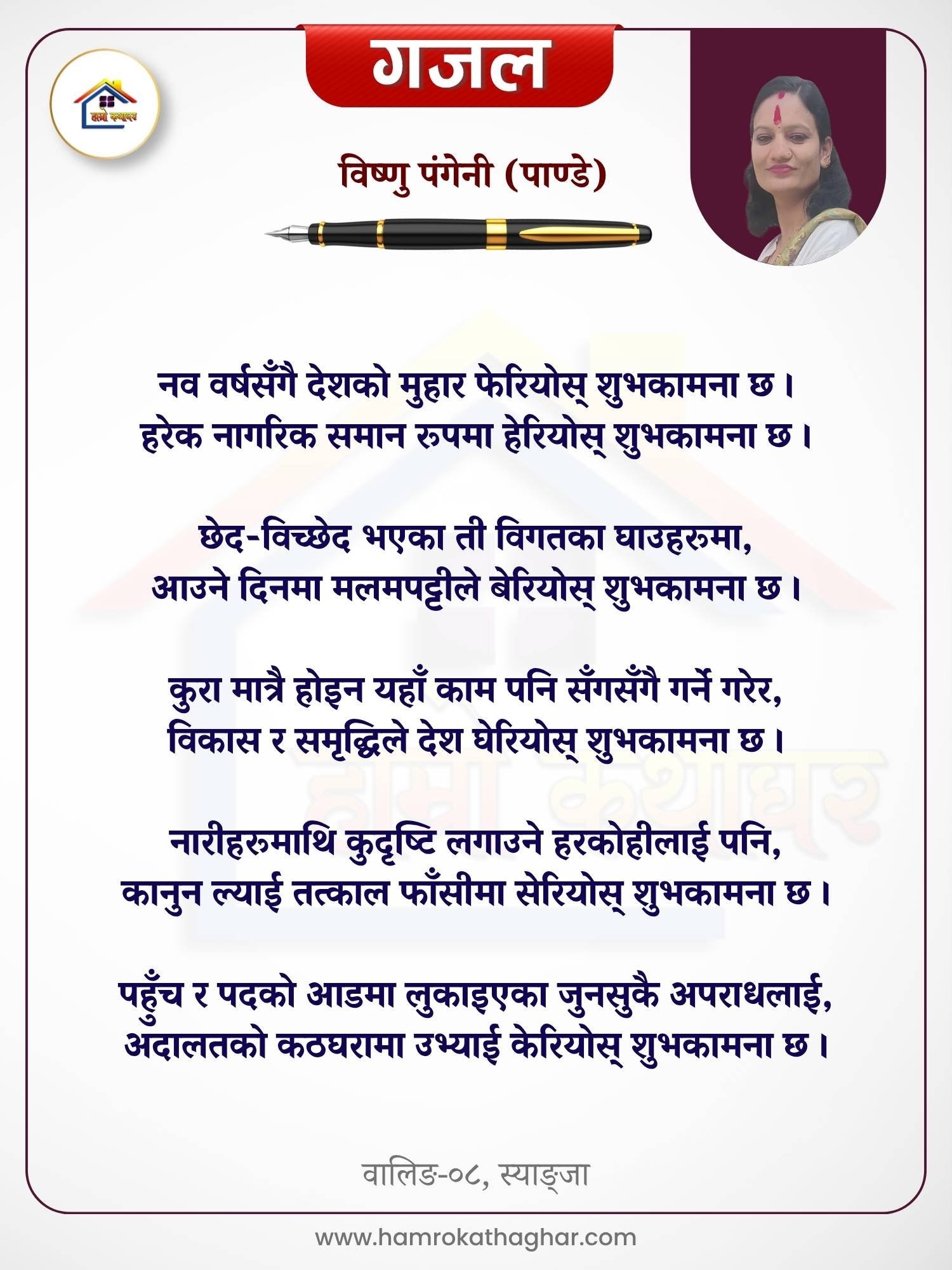 नेपाली भाषा साहित्यलाई माया गरेर यहाँसम्म आइ, यहाँ प्रकाशित लेख/रचनाहरू पढिदिनु भएकोमा तपाईँलाई धेरै धेरै धन्यवाद। तपाईँले भर्खरै माथि पढेको लेख/रचना कस्तो लाग्यो कमेन्ट बक्समा आफ्नो प्रतिक्रिया राख्न सक्नु हुनेछ। आफ्नो मनमा लागेको प्रतिक्रिया राख्न तपाईँ स्वतन्त्र हुनुहुन्छ। यदि तपाईँ पनि नेपाली भाषा साहित्यमा कलम चलाउनु हुन्छ भने आफ्नो छोटो परिचय र एक प्रति अनुहार चिनिने तस्बिर सहित आफ्ना लेख/रचनाहरू हामीलाई hamrokathaghar@gmail.com मा पठाउन सक्नु हुनेछ। अन्य कुनै पनि जानकारीका लागि +९१८७३८०९३५७३ नम्बरमा ह्वाट्सएप गर्न सक्नु हुनेछ। धन्यवाद । नोट: यहाँ प्रकाशित कुनै पनि लेख/रचनाहरू लेखकको वा 'हाम्रो कथा घर' को अनुमति बिना कुनै पनि माध्यमबाट प्रकाशन प्रसारण गर्न पाइने छैन । अन्यथा, यस्तो गरिएको पाएमा प्रचलित कानुन बमोजिम कारबाही गरिने जानकारी गराउँदछौ।