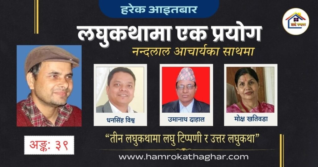 यसै प्रयोगलाई निरन्तरता दिँदै उहाँले हाम्रो कथाघरको “लघुकथामा एक प्रयोग” स्तम्भ सञ्चालन गर्दै आउनुभएको छ । यस स्तम्भमा उहाँले प्रत्येक पटक तीन स्रष्टाका लघुकथा छनोट गरी तिनको विश्लेषणात्मक समीक्षा गर्नुका साथै तिनै कथामा आधारित उत्तरकथाहरू पनि सिर्जना गर्नुहुन्छ । यसरी उहाँले समीक्षा र सिर्जनालाई एकैसाथ अगाडि बढाउँदै नेपाली लघुकथामा एउटा नवीन र महत्वपूर्ण आयाम थप्नुभएको छ ।