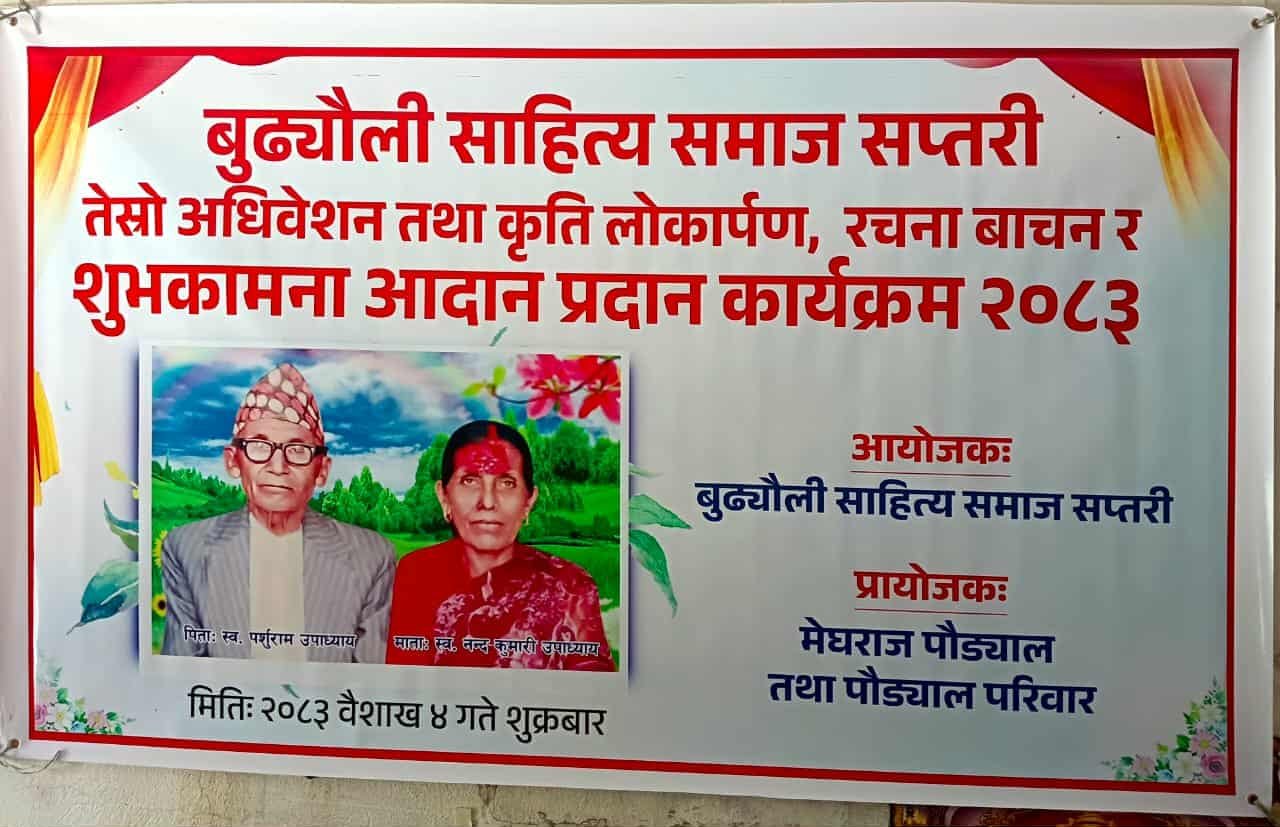 बुढ्यौली साहित्य समाज, सप्तरीद्वारा आयोजित समारोहमा वरिष्ठ स्रष्टा मेघराज पौड्यालको शोक-लघुकाव्य ‘जीवनका उकाली ओरालीहरू’ को लोकार्पण गरियो । यो केवल एउटा पुस्तकको विमोचन मात्र थिएन ; यो त आफ्ना जन्मदाताप्रति कृतज्ञता व्यक्त गर्न अक्षरहरूले गरिएको एक पवित्र ‘मानस-पूजा’ थियो ।